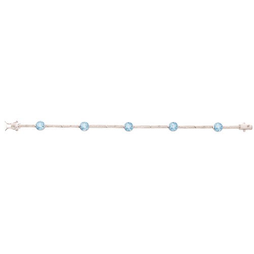 Let the captivating blue topaz and dazzling diamonds wow you and your friends. Stunning blue topaz stones set on a 7mm bezel. Features round .08twt diamonds along. Set in sterling silver with an e-coat to prevent any tarnish. Secures with a classic box clasp. Measures 7.25” long. Shipped in Jilco custom purple gift box that holds every piece to perfection. Gift box features a ribbon and protective tissue paper.